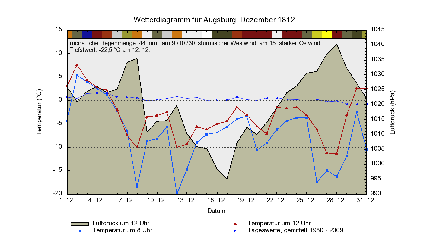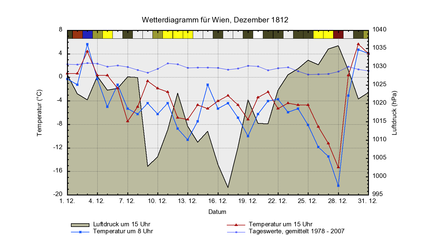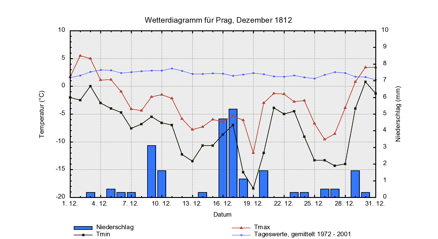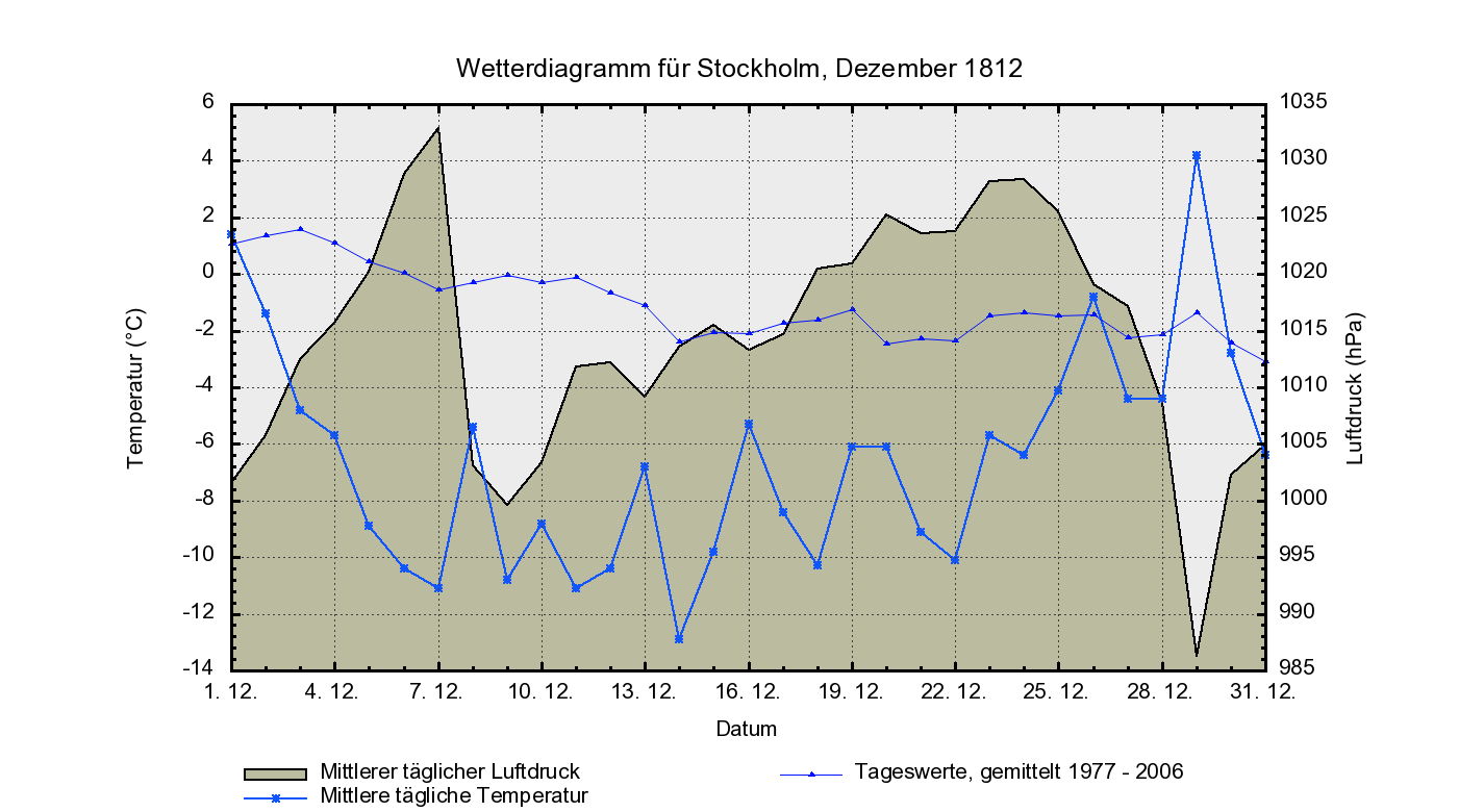 Der Wetterablauf im Dezember lässt sich dank der zahlreichen Berichte der (überlebenden) Feldzugsteilnehmer relativ gut rekonstruieren – umso mehr, da jetzt das Wetter die entscheidende Rolle für das Überleben spielte und deshalb zu entsprechend häufigen Erwähnungen in Tagebüchern und Memoiren führte. Da bleibt es allerdings auch nicht aus, dass man zuweilen auf sich widersprechende Äußerungen stößt; zudem muss man bedenken, dass zwischen Vorhut und Nachhut oft eine größere Strecke lag – nicht mehr so viel wie noch im November, aber noch genügend, dass durchaus unterschiedliche Wettererscheinungen von ein- und demselben Tag gemeldet werden konnten. Ich habe versucht, aus all diesen Berichten einen möglichst konsistenten Wetterablauf ("Wettertagebuch der Truppe") zu erstellen für jeden Tag des Monats, soweit möglich. Im nächsten Abschnitt wird dann versucht, aus diesen Truppen-Wettermeldungen und den 1812 europaweit gemessenen Wetterdaten (siehe Abb. 1 - 3 und die Wetterdiagramme) die damals herrschenden Wetterlagen zu rekonstruieren.