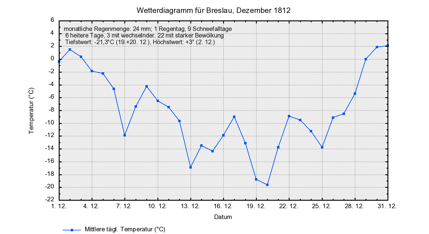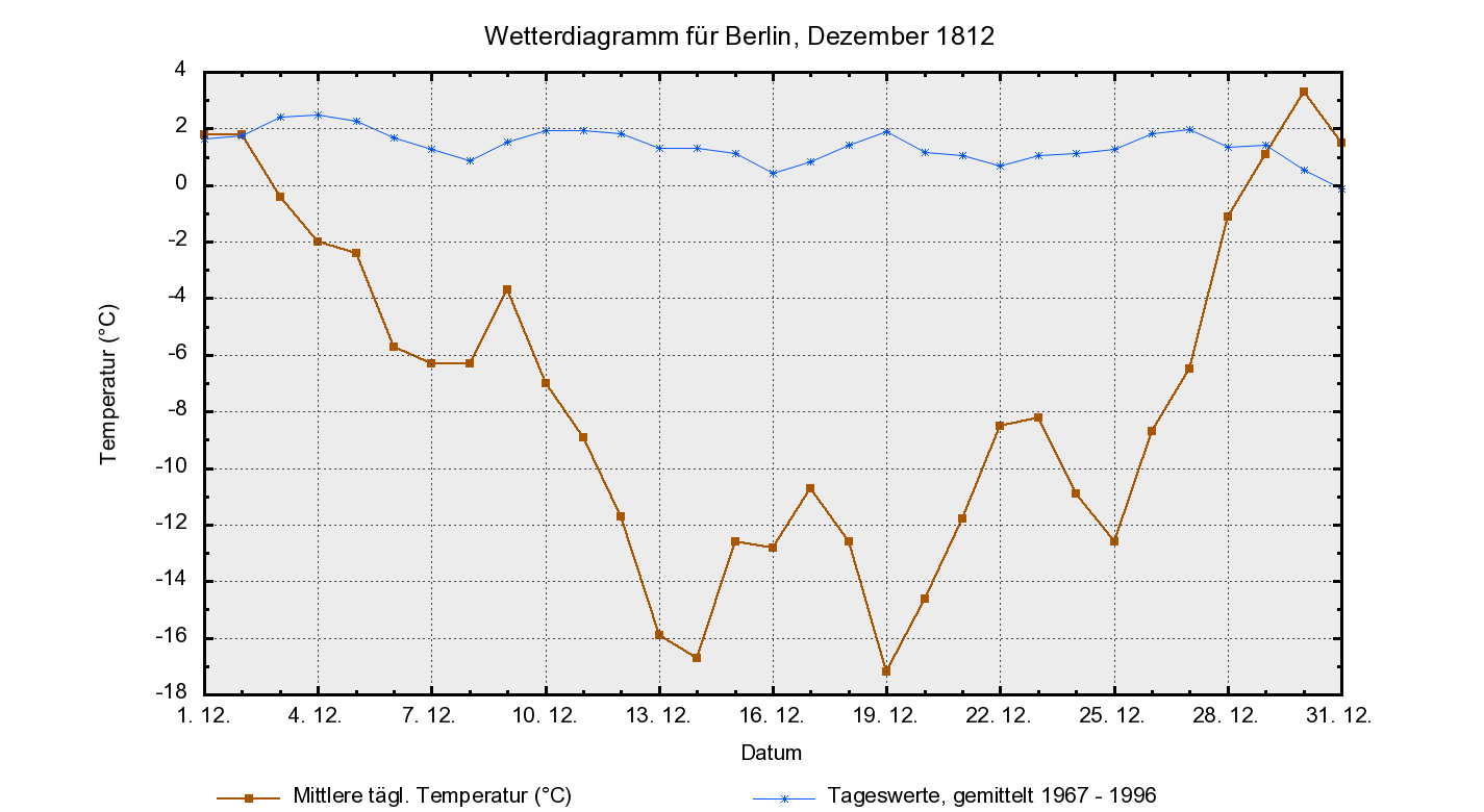 | 26. 12. | Königsberg | Temperaturanstieg auf -22°C. Bis zu Larreys Abreise aus Königsberg am 2. Januar stieg nach seinen Messungen in der Stadt die Temperatur nie über die -20°C-Marke an! Letzteres kann aber nicht stimmen: denn nach den Weihnachtsfeiertagen setzte eine deutliche Milderung ein; so stiegen in Danzig [18] tagsüber die Temperaturen auf bis +5°C an und auch die Nächte blieben bis Jahresende frostfrei und in Wilna schwankten die Temperaturen nur leicht um 0°C herum. |