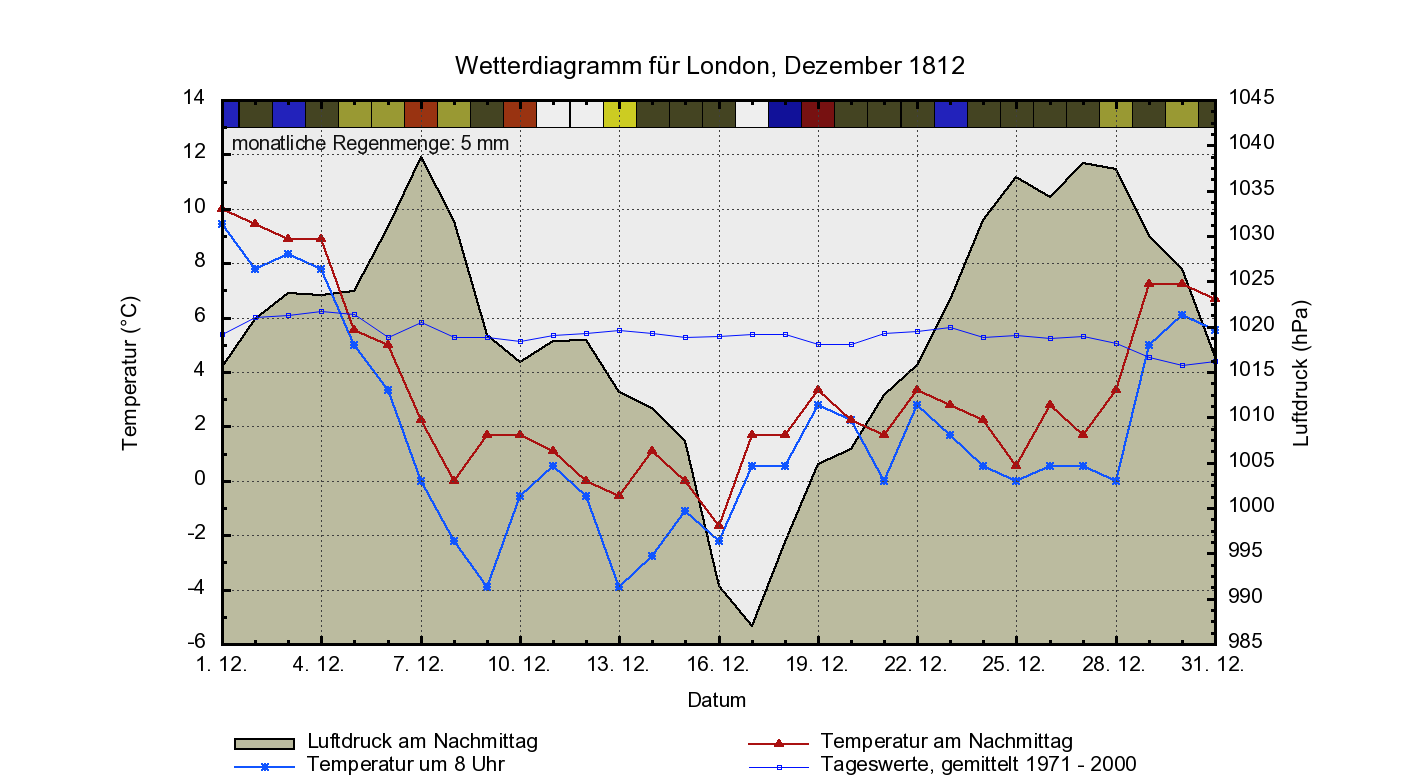 Mittlerer Luftdruck (auf Meeresniveau reduziert) im Dezember 1812; der Abstand der Isobaren (weiß