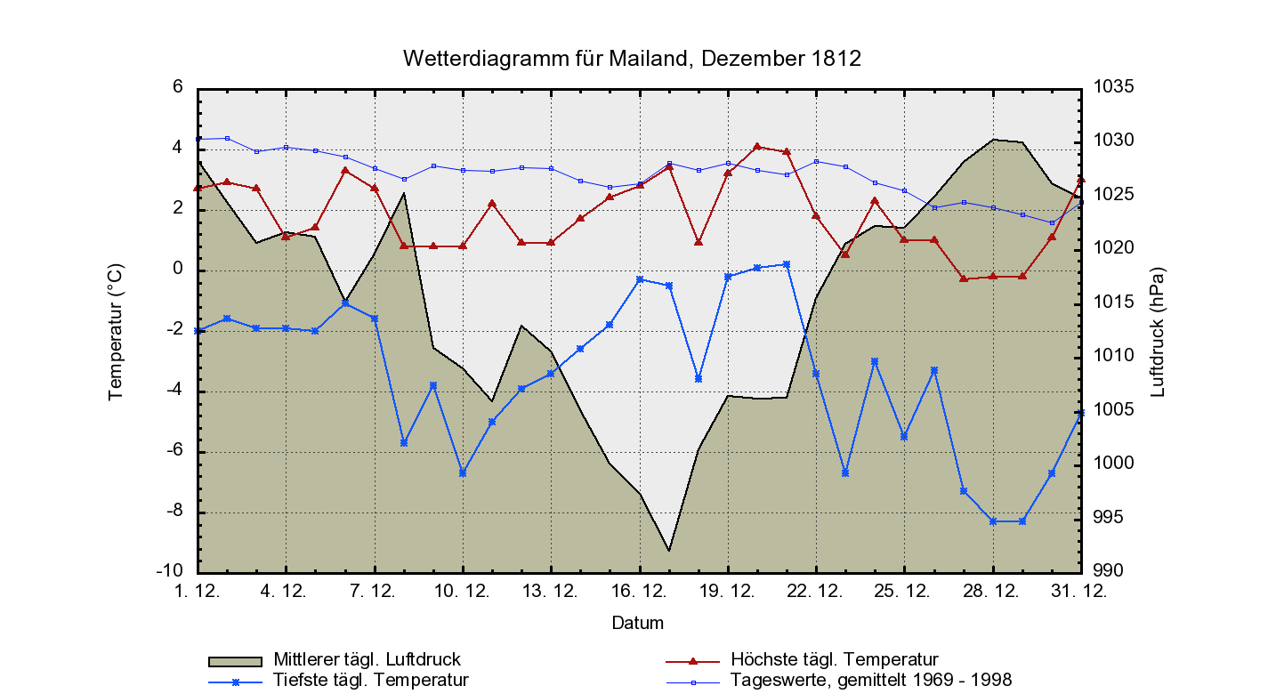 Oben im Wettertagebuch wurden auch die Messungen des Arztes Larrey aus Königsberg angegeben: Temperatur dort am Weihnachtstag -27°C., dann Temperaturanstieg auf -22°C. Der Temperaturanstieg nach Weihnachten passt gut zu der oben erläuterten Wetterlage für diese Tage, allerdings erscheinen die Temperaturen Larreys doch deutlich zu niedrig, wenn man die Werte aus Berlin, Stockholm und St. Petersburg damit vergleicht. Bis zu Larreys Abreise aus Königsberg am 2. Januar soll nach seinen Messungen in der Stadt die Temperatur nie über die -20°C-Marke angestiegen sein. Dies nun kann eigentlich nicht richtig sein – das Tief vom 29. muss auch in Königsberg zu einem erheblichen Temperaturanstieg bis nahe oder sogar leicht über 0°C geführt haben. Alle anderen Städte um Königsberg herum, Wilna, St. Petersburg, Stockholm, Berlin, Breslau und vor allem Danzig zeigen diesen deutlichen Anstieg. Könnte es aber so gewesen sein, dass am 31. oder 1. die von Norden vorstoßende extrem kalte Luft wieder Ostpreußen überflutet hat? Larrey hätte dann die Temperatur seines Abreisetages einfach nur zu sehr verallgemeinert. Allerdings spricht dagegen, dass es in Danzig [18] noch bis weit in den Januar hinein mild blieb, und auch Wilna meldete am Neujahrstag nur leichten Frost und in den Folgetagen nur sehr moderaten. All dies zeigt, dass man mit den überlieferten Thermometermessungen vorsichtig umgehen muss!