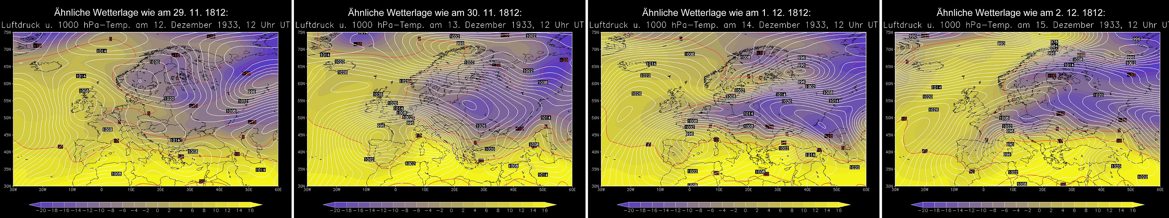 Der Zeitraum 12. -15. Dezember 1933 wird hier als Analogie für den Zeitraum 29. 11. - 2. 12. 1812 betrachtet, siehe Abb. 10. Es sei aber vorweggeschickt, dass die Übereinstimmung der beiden Wetterlagen zwar sehr gut für Nord- und Osteuropa ist, weniger gut aber für West- und Mitteleuropa: vor allem ist es Mitte Dezember 1933 in Mitteleuropa schon deutlich kälter als Anfang Dezember 1812. Aber uns interessiert hier ja, wie die "Temperaturschaukel" in Nordosteuropa funktioniert und das wird durch Abb. 10 gut demonstriert.