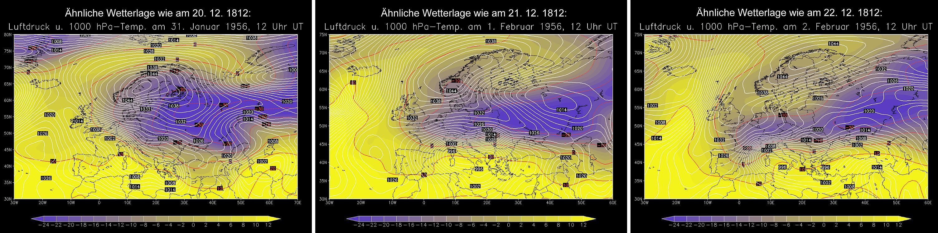 Im Folgenden benutze ich immer die Daten von 1812 – die dazu analogen von 1933 siehe Abb. 10. Am 29. 11. liegen Skandinavien und Nordrussland unter einem Hochdruckgebiet mit einem Kerndruck um die 1023 hPa; arktische Kaltluft ist eingeflossen und in den klaren Nächten werden über Schneeflächen, vor allem in etwas weiter von der (noch wärmenden, da noch nicht zugefrorenen) Ostsee entfernten Gebieten, schon sehr tiefe Temperaturen erreicht. Am 30. 11. aber näher sich von Westen kommend ein Tiefdruckgebiet, das aber weit nördlich, etwa am Nordkap, nach Skandinavien hineinzieht; der Luftdruck beginnt großräumig zu fallen, das Skandinavienhoch wird nach Süden abgedrängt. Gleichzeitig führt das Tief auf seiner Vorderseite vom Atlantik mitgebrachte angewärmte (Golfstrom!) Meeresluft mit sich und entsprechend beginnt die Temperatur über Skandinavien schon zu steigen. Bis zum 1. 12. ist das Tief unter weiterer Verstärkung (Kerndruck nun bei 988 hPa, über Stockholm bei 1000 hPa) nach Osten gezogen und liegt nun in der St. Petersburger Gegend. Gut zu erkennen in der dritten Wetterkarte von Abb. 10 die ausgeprägte Warmluftschleppe, die sich quer über die Ostsee zieht und bis St. Petersburg reicht (während ganz im Norden schon wieder kältere Luft vorstößt). Aber ebenfalls gut zu erkennen: das Baltikum und Weißrussland verbleiben in der Kaltluft! Die milden Luftmassen ziehen quasi "streifend" bzw. knapp nördlich vorbei. (Und über Mittel- und Westeuropa herrscht relativ hoher Luftdruck vor.) Die von der Truppe gemeldeten Schneefälle am 1. 12. 1812 bei sehr kalten Temperaturen sind also leicht zu erklären: das heranziehende Tief ist dafür verantwortlich.