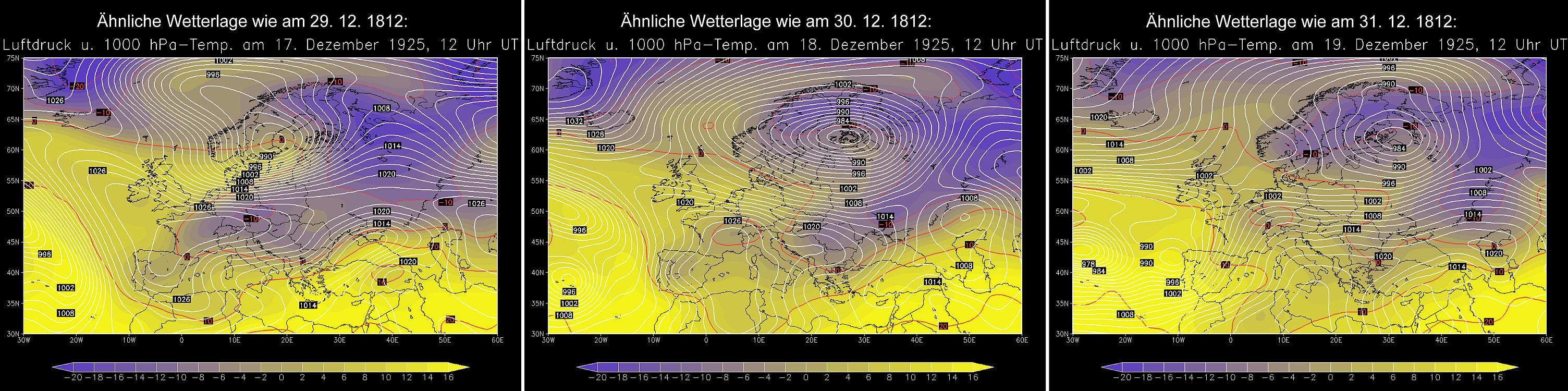 Am 29. Dezember zieht von NW kommend ein stark ausgeprägtes Tief nach Skandinavien; innerhalb von 24 h fällt in Stockholm der Luftdruck um rund 30 hPa und die Tagesmitteltemperatur steigt steil an von knapp unter -4°C auf über +4°C! Und in St. Petersburg werden am 29. 0°C erreicht, in Wilna am 30. sogar etwa +3°C. Die drei Wetterkarten der Abb. 16 zeigen die Situation, wie sie in etwa vom 29. - 31. über Europa geherrscht haben muss. (Die Beispielkarten stammen aus dem Dezember 1925; die Druckverteilung über Europa ist der von 1812 tatsächlich sehr ähnlich, sogar was den Kerndruck des Tiefs über Skandinavien angeht. Allerdings ist 1812 der Kern des Tiefs wohl von Stockholm aus auf einer etwas südöstlicheren Bahn und auch schneller als 1925 weitergezogen.) Das kräftige Tief führt auf seiner Vorderseite einen großen Schwall milder Luft Richtung Osten; schon am 29. meldet London +7°C und Berlin +2°C, während in Süddeutschland und Österreich die Temperaturen noch unter dem Gefrierpunkt bleiben. Am 30. aber setzt sich die milde Luft auch dort durch; gleichzeitig fängt es über Skandinavien und Nordwestrussland wieder an, deutlich kälter zu werden, denn nach Durchzug des Tiefkerns wird auf dessen Rückseite erneut arktisch-sibirische Kaltluft angezapft. Am 31. bricht diese Kaltluft wieder mit großer Heftigkeit über den Norden Europas ein: so meldet Stockholm am Silvestertag eine Tagesmitteltemperatur lediglich -6°C; aber wirklich drastisch ist der Temperatureinbruch in St. Petersburg mit -22°C Tagesmitteltemperatur! Der Rest Europas aber merkt davon (noch) nichts; hier hat sich an der Südflanke des Tiefs bei weiter zurückgehendem Luftdruck eine Westströmung eingestellt und es bleibt bis ins neue Jahr hinein mild (nennenswerter Frost tritt in Berlin z.B. erst ab Mitte Januar 1813 wieder auf).