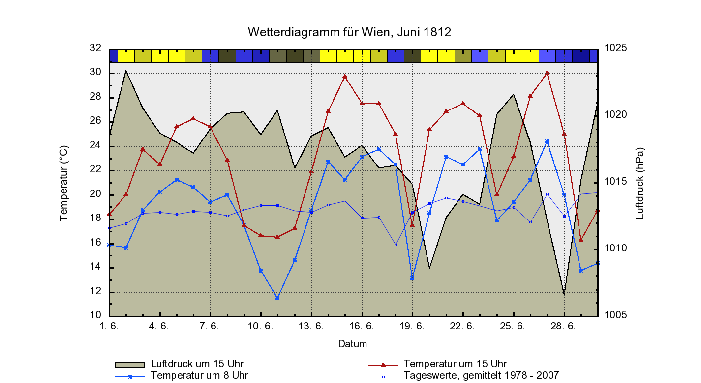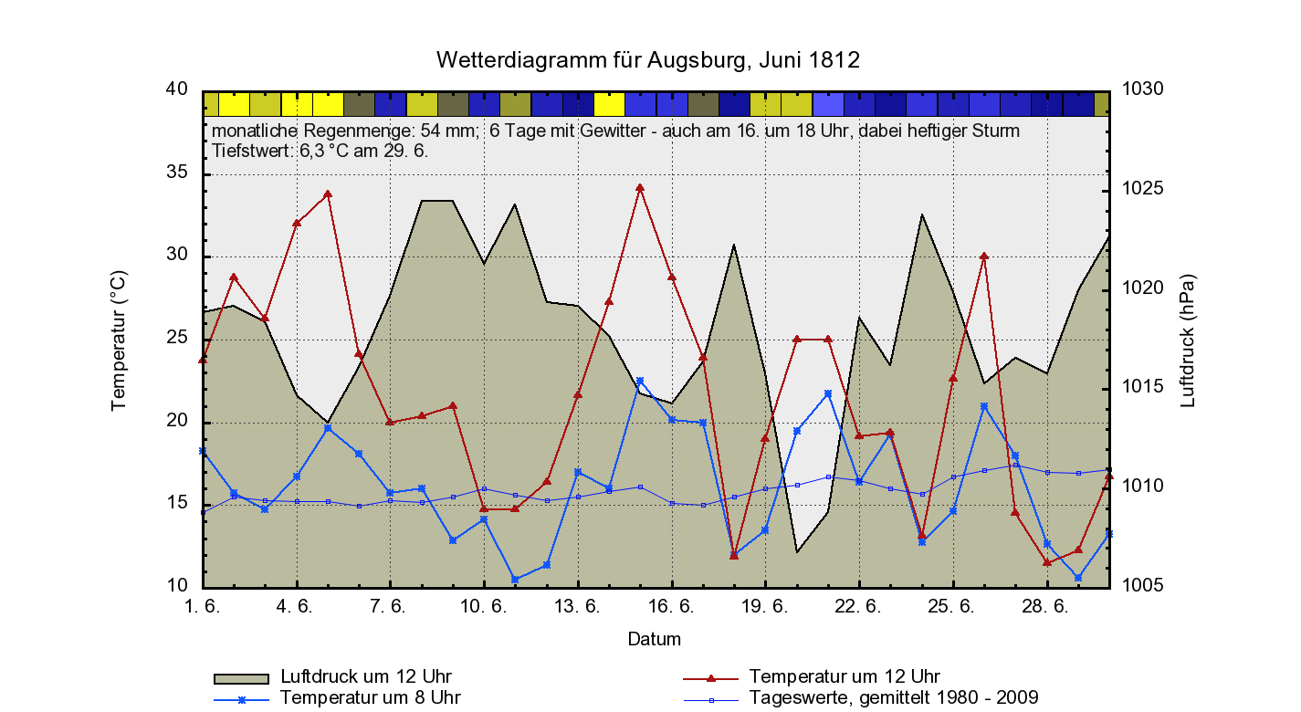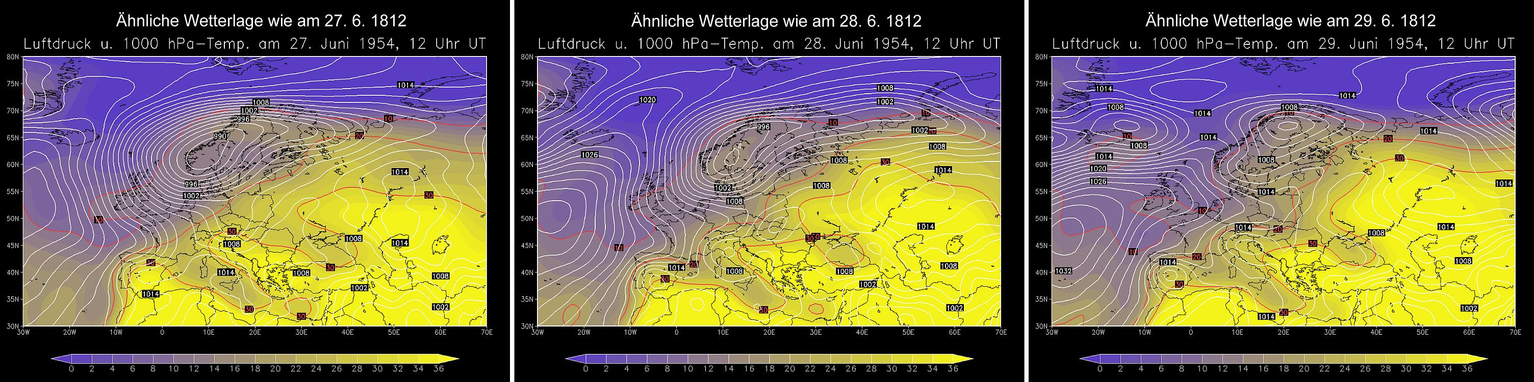 Die Wetterlage, die recht gut zu diesen Wettermeldungen passt, ist ein Tiefdruckkomplex über Nordwesteuropa, dem meist hoher Luftdruck über Südosteuropa entgegensteht. Abb. 1 zeigt für das Monatsmittel ja schon diese Lage, aber in der zweiten Hälfte des Monats ist diese NW-SO-Teilung noch deutlich prononcierter. Zu dieser Teilung passen auch die Bewölkungsverhältnisse: herrscht über London meist trübes Wetter vor, ist Augsburg schon deutlich sonniger, aber auch mit vermehrtem Schaueraufkommen (die hellblau markierten Tage im Diagramm sind solche, die sonnig starten und in denen sich dann Regenschauer entwickeln) und Wien schließlich zeigt den höchsten Sonnenanteil. Von SW nach NO läuft somit eine Trennlinie durch Europa, die den kühleren NW vom wärmeren SO trennt (Abb. 2 zeigt dies ja recht deutlich); entlang dieser Trennlinie, die sich im Monatsverlauf (vor allem der zweiten Hälfte) immer wieder vor und zurück verschiebt, kommt es gehäuft zu schauerartig verstärkten Niederschlägen und Gewittern, bedingt durch den häufigen Wechsel bzw. den Zusammenstoß kühler und warmer Luftmassen. Das erste Diagramm der Abb. 8 zeigt am Beispiel des Junis 1954 die Großwetterlage, wie sie in etwa am 27. 6. 1812 über Europa zu finden war.