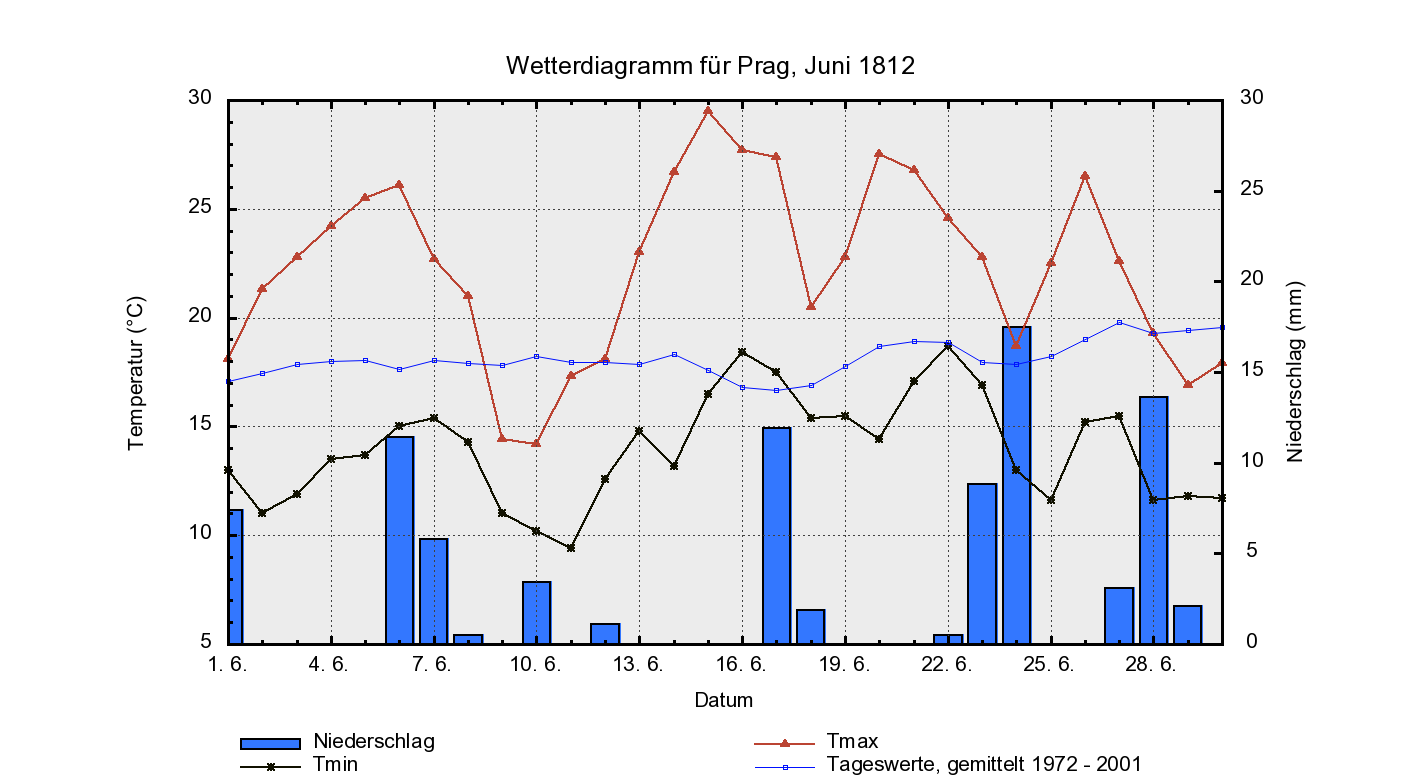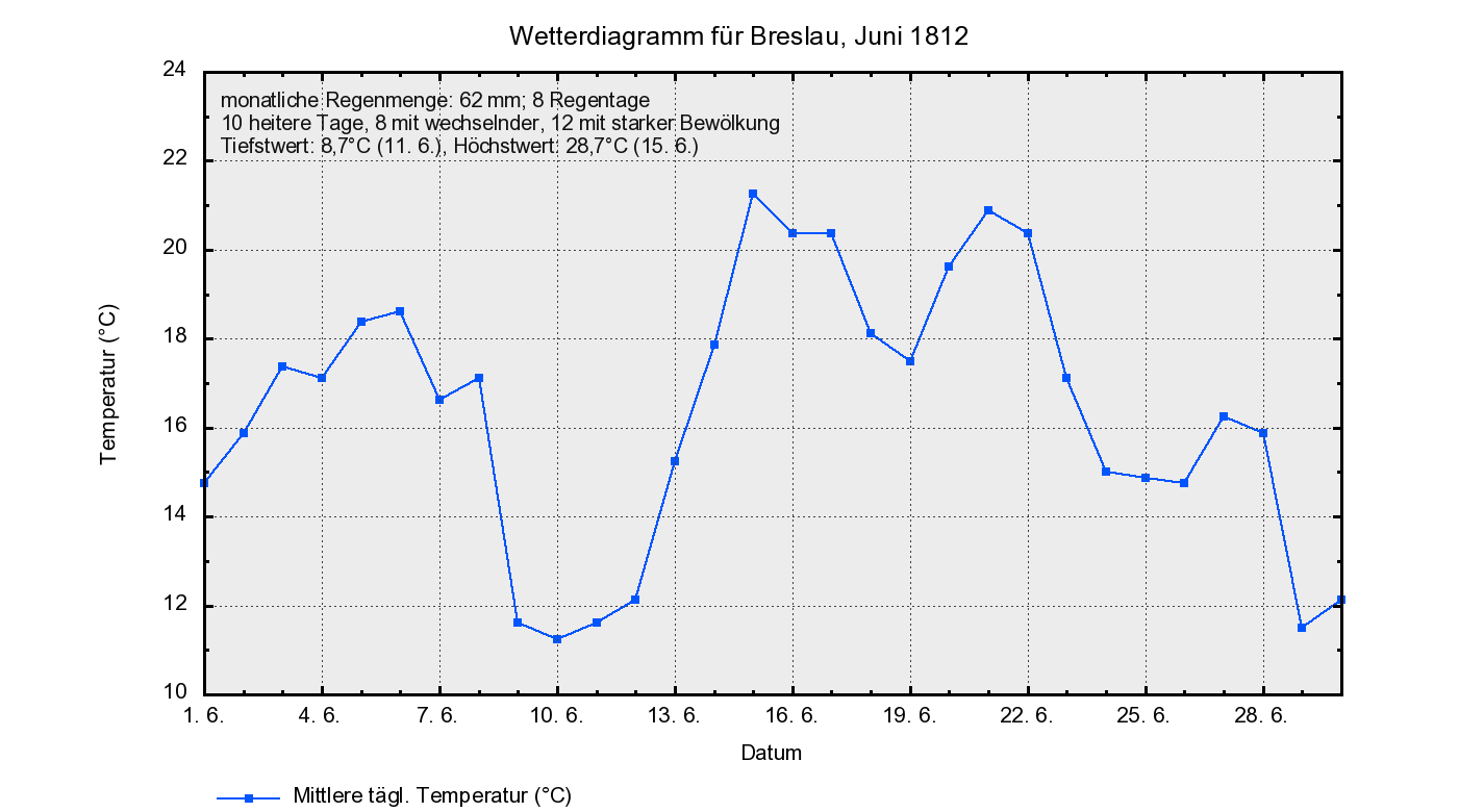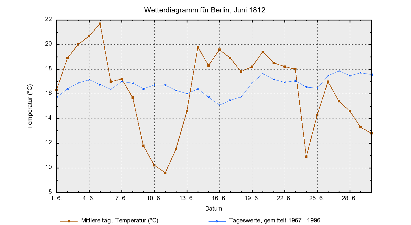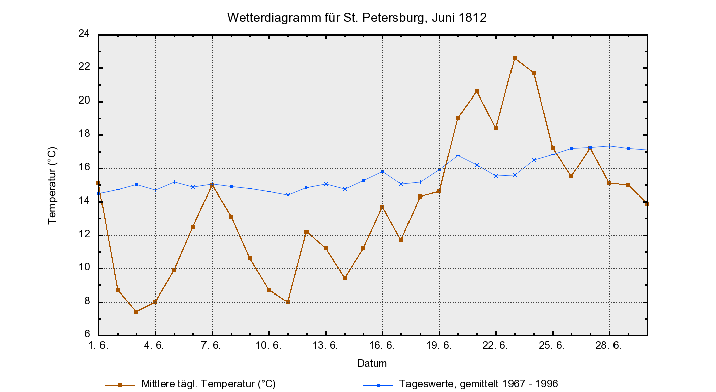 Die Woche vor Kriegsbeginn gab es in St. Petersburg die ersten paar wirklich schönen und sehr warmen Tage im Juni 1812, mit Temperaturen um die 30°C. Die Wochen vorher waren hingegen unerfreulich kühl ausgefallen. Davon allerdings bekam der Zar nichts mit, denn er hielt sich in Wilna auf, in Erwartung der Armee Napoleons. In Wilna war es in diesem Juni wärmer als in St. Petersburg, und wie dort waren auch hier die Tage vor Invasionsbeginn ziemlich heiß. Während aber die russische Armee nur abwarten musste, musste die napoleonische noch viel marschieren. Und dabei hatte diese Armee ja schon eine große Marschleistung hinter sich, kamen die Soldaten doch aus so weit entfernten Ländern wie Frankreich, Italien, Holland, (West)Deutschland. Aber Eilmärsche mit voller Ausrüstung (etwa 25 kg musste ein gewöhnlicher Soldat auf seinem Rücken mitschleppen) bei großer Hitze bringen jeden Soldaten rasch an den Rand des Zusammenbruchs. Von daher hätte die napoleonische Armee zwei Dinge gebraucht, um ihre volle Leistungsfähigkeit wieder herzustellen: ein paar Tage Pause und trockenes, mäßig warmes Wetter. Ersteres wurde von Napoleon selbst verhindert: immer in Sorge, die russische Armee könnte ihm entkommen (die er ja unbedingt zur Schlacht stellen wollte), trieb er seine Männer fast permanent zu Eilmärschen an. Und auch das Wetter spielte nicht mit – vielmehr blieb dieser Juni seiner Linie bis zum Monatsende treu: wechselhaft, mit großer Neigung zu Gewitterunwettern.