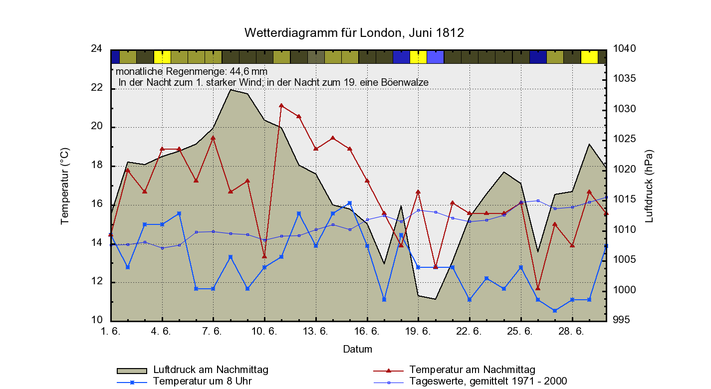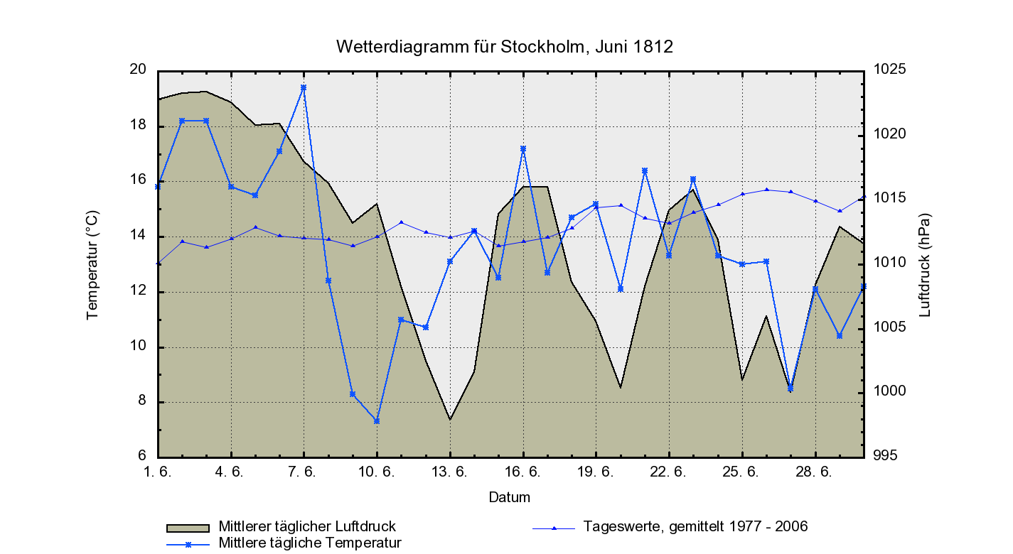 Sehr hilfreich ist es, sich aber auch das Wetterdiagramm von Stockholm näher anzusehen. Deshalb wird es als Abb. 6 gezeigt (obwohl es weiter unten als Bestandteil der Wetterdiagramm-Sektion nochmals eingebaut ist). Sehr markant die Luftdruckeinbrüche am 13., 20. und 25. des Monats, während das erste Monatsdrittel noch von hohem Luftdruck dominiert ist. In diesem Zeitraum liegen die Temperaturen auch deutlich über den langjährigen Normalwerten (die dünne blaue Linie im Diagramm); ab dem 8. aber gehen die Temperaturen dann deutlich zurück und bis Monatsende herrscht ziemlich wechselhaftes Wetter vor, wie man gut an dem ständigen Auf und Ab sowohl des Luftdrucks als auch der Temperaturen erkennen kann. Gerade die letzten 5 Tage des Monats fallen dabei besonders kühl aus, am kühlsten der 27. In St. Petersburg hingegen findet vom 20. - 24. eine kurze Hitzewelle statt (siehe Diagramm in der Diagramm-Sektion weiter unten), wovon in Stockholm keine Rede sein kann. Ab dem 25. aber geht auch in St. Petersburg die Temperatur deutlich zurück. Auch zwischen Kaunas und Wilna sind die Tage vom 20. - 24. sehr heiß, wie man ja aus den Berichten der napoleonischen Soldaten weiß (siehe Wettertagebuch). In Mitteleuropa jedoch sind diese Tage wechselhaft: erst warm, dann kühl, dann wieder warm, wobei es immer wieder zu teils kräftigen Regenfällen kommt (siehe Diagramme von Augsburg, Prag, Wien). In London bleibt es, wie überhaupt die ganze zweite Monatshälfte über, recht kühl.