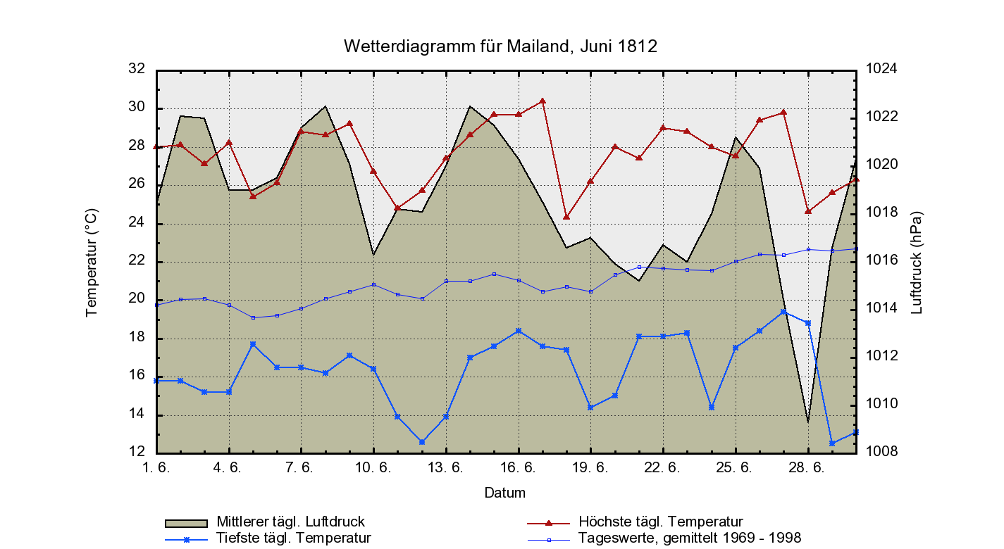 10. 7. | Wilna | mittags noch 30°C, dann aber schweres Gewitter mit kräftigen Windböen und heftigem Regen in Wilna. Napoleon selbst wird dabei zu Pferde vor den Toren Wilnas bei einer Truppenparade davon erwischt und bis auf die Haut durchnässt. In den Folgetagen deutlicher Temperaturrückgang. |