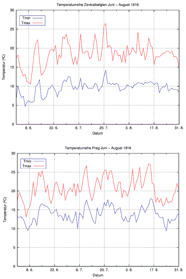 Diese Zentralbelgien-Reihe setzt sich aus den Meßreihen von fünf verschiedenen Stationen zusammen, die dann nachträglich auf die Station Uccle (nahe Brüssel) geeicht wurden. Tatsächlich stammen die hier interessierenden 1816er-Messungen aus der Station Haarlem (Niederlande), immerhin schon 170 km nördlich von Brüssel gelegen! Die Temperatur wurde dort zu dieser Zeit zweimal am Tag abgelesen: morgens um 8 und nachmittags um 13 Uhr. Die im Diagramm gezeigten Werte sind aber nicht diese Original-Haarlem - Werte, sondern die daraus gewonnenen homogenisierten Werte, wie sie dann Eingang in die Gesamtreihe Zentralbelgien fanden.