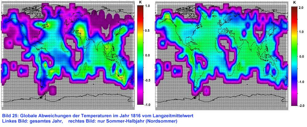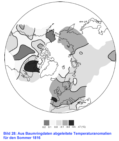 Aber wie so oft bei klimatischen Betrachtungen muss man sich davor hüten, zu sehr zu verallgemeinern. Der Sommer des Jahres 1816 war eben nicht überall schlecht und kalt, auch in diesem Jahr gab es etliche Gewinner, Regionen also mit schönem und warmem Sommerwetter - auch in Europa. Und ein weiterer Punkt muss beachtet werden: in den Jahren vor wie nach 1816 traten - zumindest in Europa - eine ganze Reihe schlechter, kalter Sommer auf. Noch mehr Vulkanausbrüche? Oder fiel der Tambora-Ausbruch zufällig in eine so oder so kühle Klimaphase hinein?