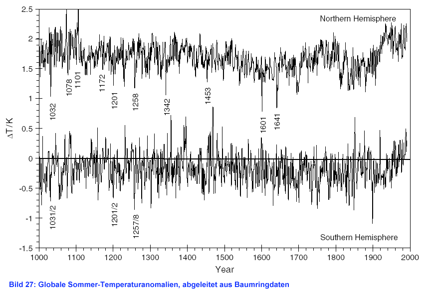 Auch wenn dies aus [6] nicht ganz klar wird, so muss es sich beim zum Vergleich herangezogenen Temperaturmittel 1961 - 1990 um das mittels instrumentellen Messungen gewonnene Mittel handeln. Da weder für die Nord- noch für die Südhalbkugel die Summe der Anomalien von 1961 - 1990 null ergibt (bei der Reihe für die Nordhalbkugel ist die Abweichung ja ersichtlich ziemlich groß), muss man daraus folgern, dass die Multi-Proxy-Daten ein Kalibrierungsproblem mit den echten instrumentell gemessenen Werten haben! (Siehe dazu auch Anmerkung 9.) Falls dieser Kalibrierungsfehler aber über den gesamten Meßzeitraum in etwa derselbe ist, bleibt die Aussagekraft von Bild 27 aber erhalten: kalte und warme Jahre können gut erkannt werden, man kann nur nicht genau sagen, welche Mitteltemperatur in diesen Jahren wirklich herrschte.
