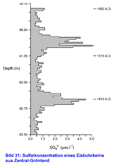 In den antarktischen Eisbohrkernen ist der Ausbruch von 1809 nicht ganz so stark ausgeprägt wie in den grönländischen Bohrkernen.