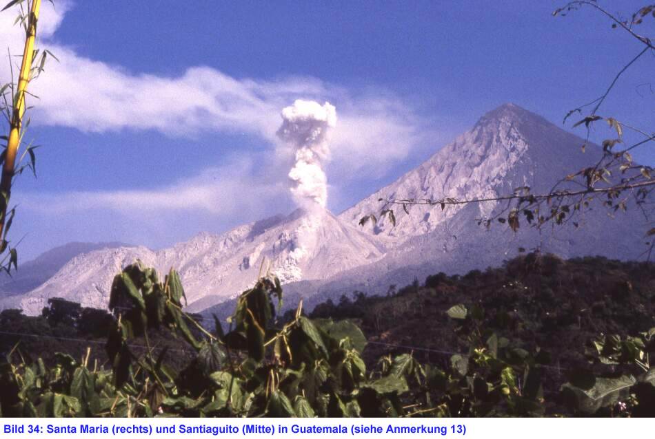 Die Aufnahme stammt vom 20. 1. 1996 und zeigt deutliche Aktivität des Santiaguito (Bildmitte), des kleinen Bruders des Santa Maria (rechts im Bild). Für diesen Zeitraum weisen die diversen, Vulkan-Aktivitäten verzeichnenden Quellen wie z.B. das Smithsonian Institute (http://www.volcano.si.edu/gvp/index.cfm) keine Einträge für den Santa Maria/Santiaguito auf - aber dieser Vulkan ist seit Jahrzehnten praktisch permanent aktiv, so dass wohl nur noch größere Aktivitäten verzeichnet werden. Eine Detailaufnahme der Asche- und Dampfwalze dieses Ausbruchs an der Flanke des Santiaguito findet sich hier (Bild 35)!