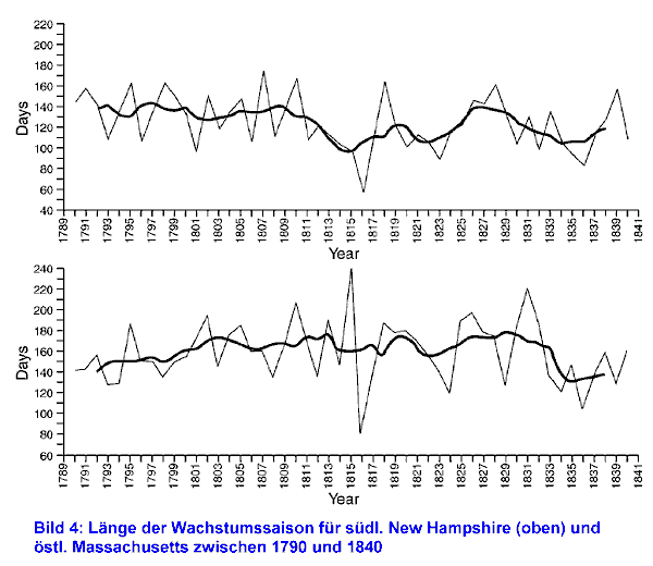 Durch eng begrenzte lokale Sommerunwetter kann natürlich an einem Ort die Ernte schwer geschädigt oder gar vernichtet werden, während es nur 100 km weiter zu keinerlei nennenswerten Schäden kommt. So könnte man diese Unterschiede für 1815 erkären - dann aber spiegeln diese Daten über die Länge der Wachstumssaison nur örtliche Gegebenheiten wider ohne Anspruch auf Flächendeckung