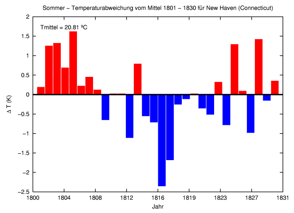 Ehrlicherweise muss man sagen, dass diese Tagesreihen weniger eindrucksvoll (schlecht) aussehen, als es die zeitgenössischen Berichte erwarten ließen. Aber hier trügt ein wenig der mitteleuropäische Blick; die Sommer in Neuengland sind nämlich im Schnitt um einige Grade wärmer als hierzulande. Wie schlecht 1816 wirklich war zeigt somit nur ein Vergleich der Abweichungen der Sommertemperaturen vom langjährigen Mittel für diese Gegend. Langjährig ist aber ein dehnbarer Begriff; Standard in der Klimatologie ist eine 30-Jahresperiode, die man heranzieht zur Berechnung der Mittelwerte. Daran orientiere ich mich und habe die Periode 1801 - 1830 benutzt für die Berechnung der mittleren Sommertemperaturen. Grundlage sind die mittleren täglichen Temperaturen und ausgeführt wurde die Berechnung nur für New Haven - aus dem simplen Grund, dass leider nicht mehr bis 1801 zurückreichende (vollständige) Neuengland-Meßreihen im GHCN-Klimaarchiv von NOAA [10] zu finden sind.